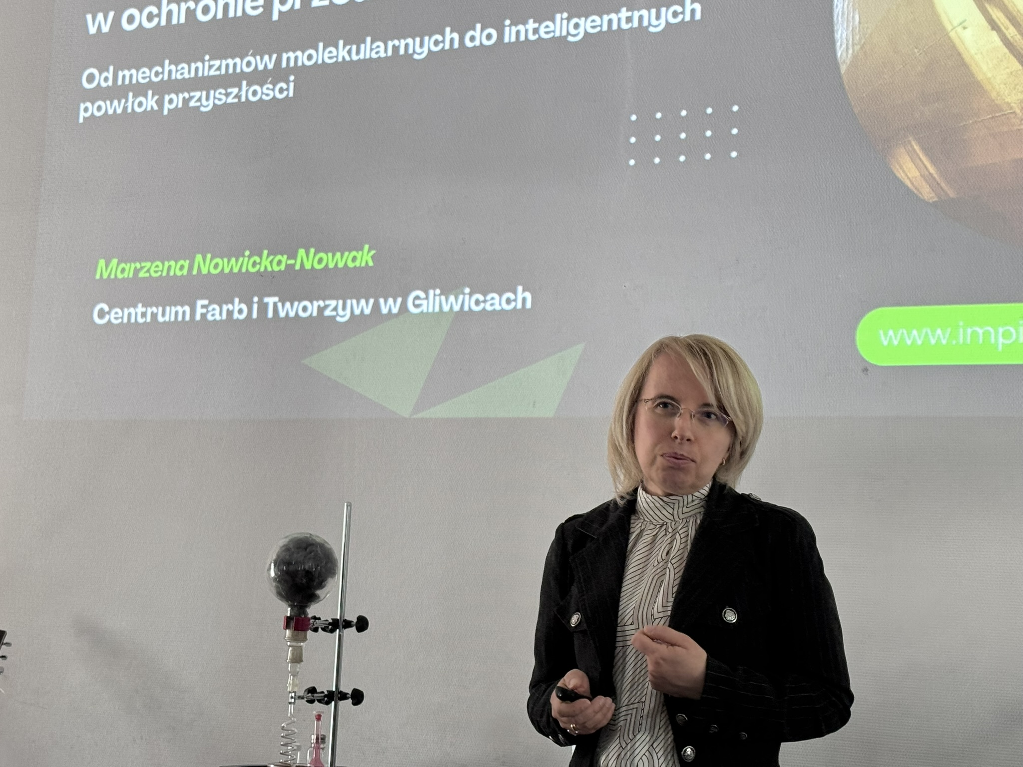 Jednym z kluczowych punktów programu był referat dr inż. Marzeny Nowickiej-Nowak pt. „Nowoczesne systemy powłokowe w ochronie przed korozją. Od mechanizmów molekularnych do inteligentnych powłok przyszłości”, w którym zaprezentowano najnowsze kierunki rozwoju powłok ochronnych – od klasycznych barier antykorozyjnych po zaawansowane systemy o właściwościach samonaprawczych i adaptacyjnych.