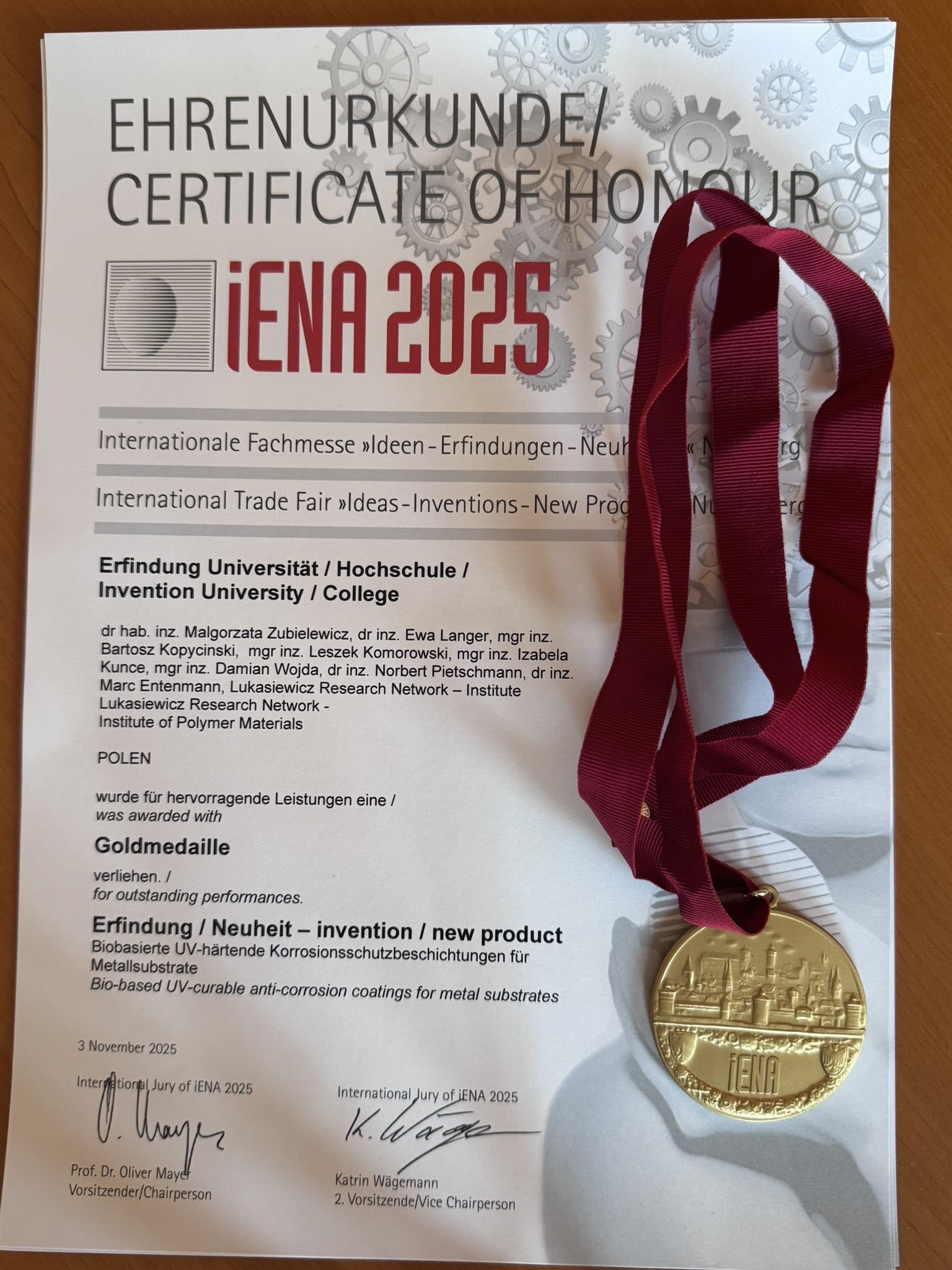 Zespół badawczy z Łukasiewicz – IMPIB, Centrum Farb i Tworzyw w Gliwicach zdobył dwa medale podczas tegorocznej edycji międzynarodowych targów wynalazków Ideas – Inventions – New Products (iENA 2025) w Norymberdze. To jedno z najważniejszych wydarzeń na świecie poświęconych innowacjom, skupiające wynalazców, zespoły B+R, przedsiębiorców oraz inwestorów z całego globu.