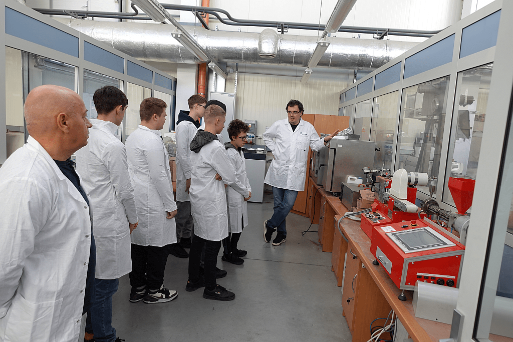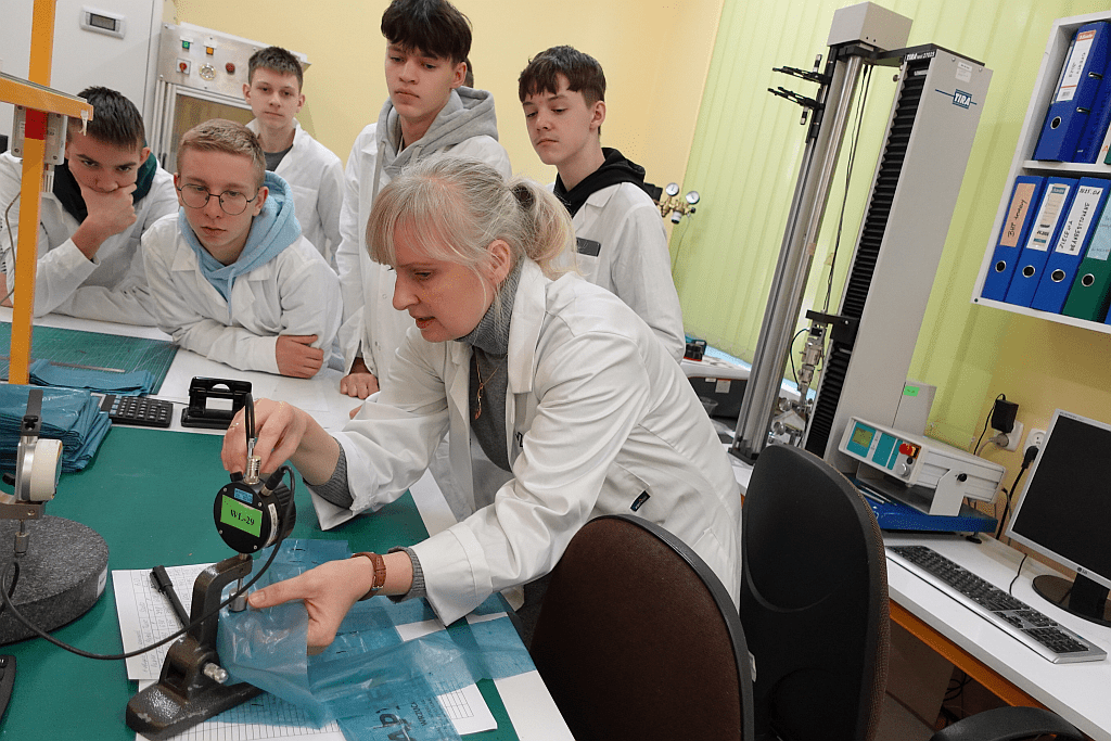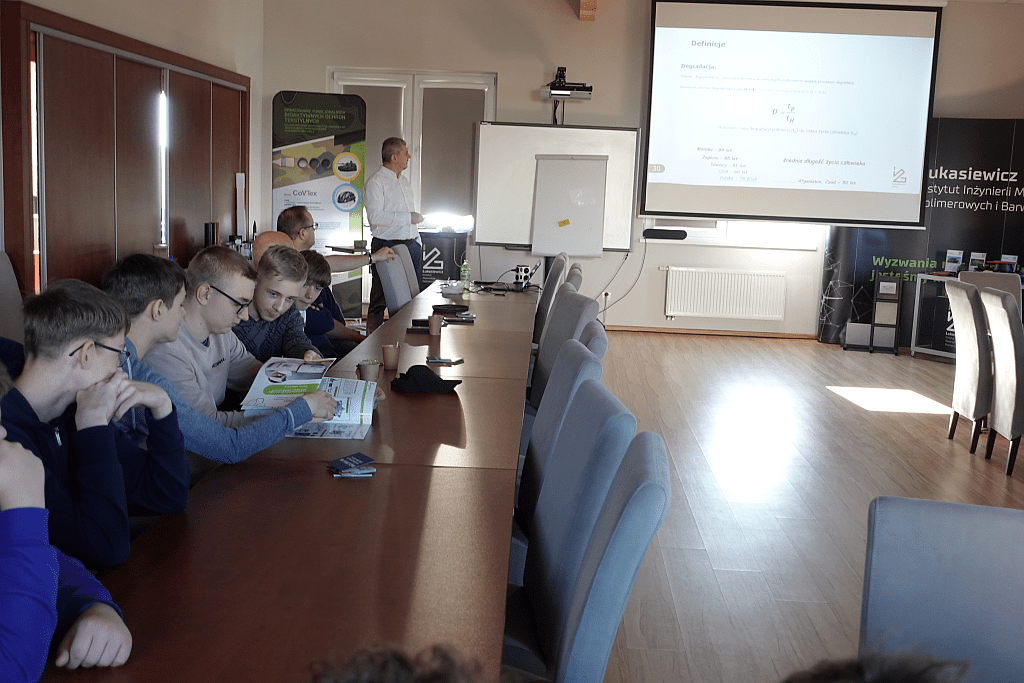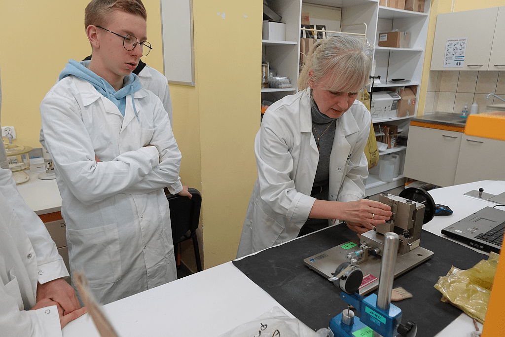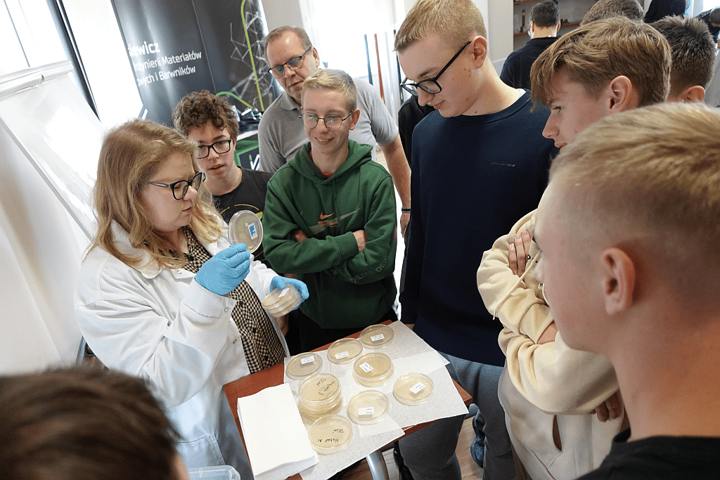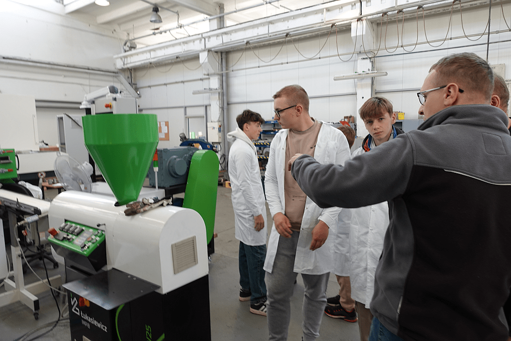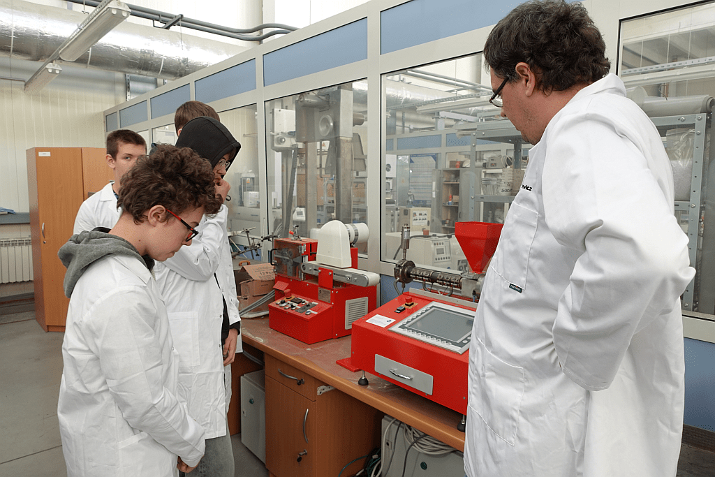 Pierwszego dnia uczestnicy zanurzyli się w praktyczny świat materiałów polimerowych. Młodzież eksperymentowała z biodegradowalnymi tworzywami oraz odwiedziła Laboratorium Badawcze POLIMER i pracownie doświadczalno-technologiczne. Uczniowie mieli okazję obserwować pracę nowoczesnej aparatury badawczej i przyglądać się procesom oznaczania właściwości fizykomechanicznych i mikrobiologicznych materiałów.
